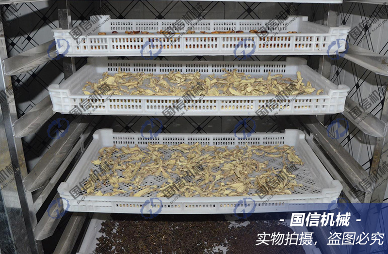 烘干生姜片應選肥大無嫩芽的新鮮姜切片,用(預煮)漂燙殺青機燙5-6分鐘,使姜內的淀粉潤潔。然后送入生姜烘干機烘干室內烘干,溫度以65-70℃為宜。烘時溫度應逐漸上升,免得淀粉糖化、變質發黏。