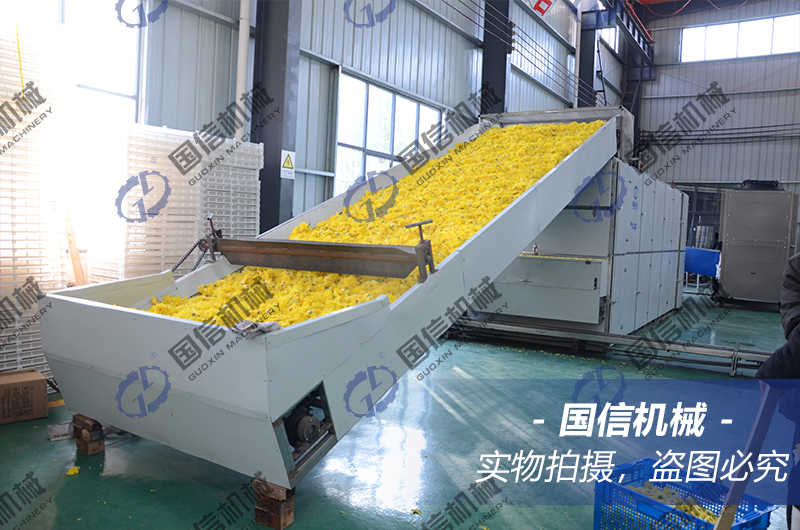 如果對于烘干外形要求不太高,或者烘干產量比較大,那么就可以使用網帶式的全自動菊花烘干機;全自動菊花烘干機,采用的是多層網帶式的烘干結構,可對菊花進行24小時不間斷烘干處理,烘干產量大、速度快、生產效率高、效果好、干凈衛生,當然前期設備投資也比菊花烤房要大。這種帶式的全自動菊花烘干機一天的加工處理量可達十幾噸到近百噸之間,全自動烘干加工,省時省力省工,為客戶節省了不少資金,從而創造出了更大的利潤。