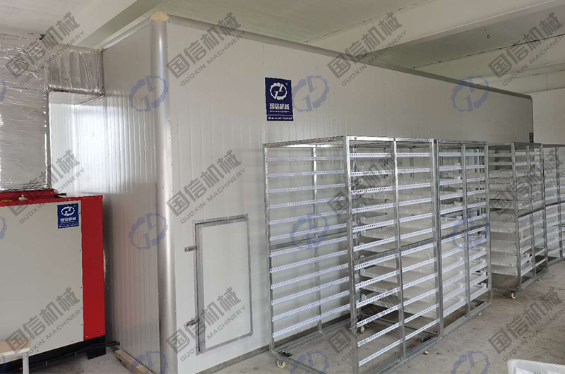 羊肚菌空氣能烘干房是由提供熱源的熱泵主機、保溫效果非常好的聚氨酯板房、能使熱量高效循環的風機系統和精致的推車托盤組成。