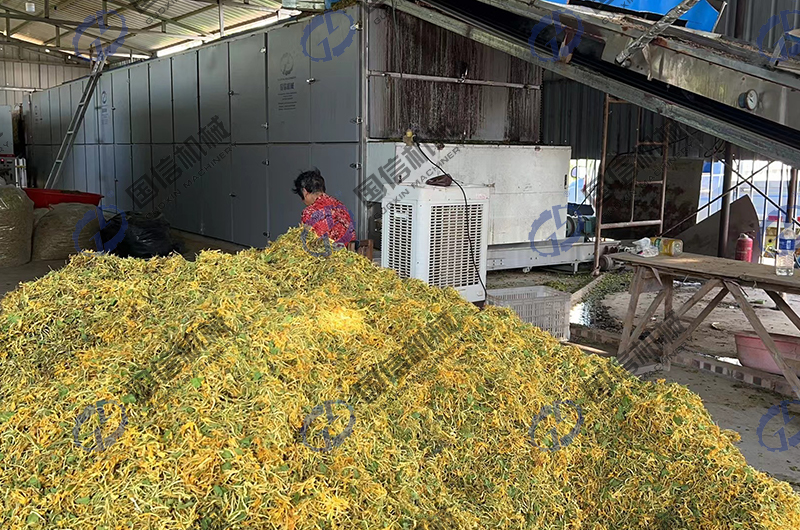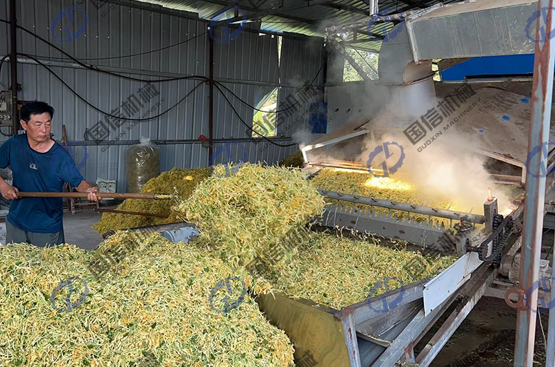 國信烘干機廠家通過對市場上人們干制金銀花的需求進行研究,推出了全自動流水線的金銀花烘干加工設備-大型全自動金銀花烘干機設備。