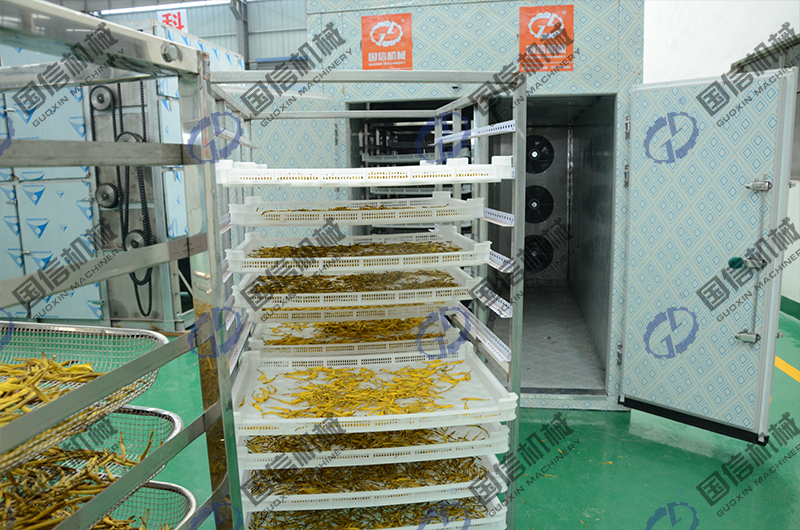 國信廠家推出的新型黃花菜殺青烘干一體機主要有兩種:一種是可以實現全自動化殺青烘干加工的大產量流水線設備,另一種是中小產量的空氣能熱泵殺青烘干房設備。