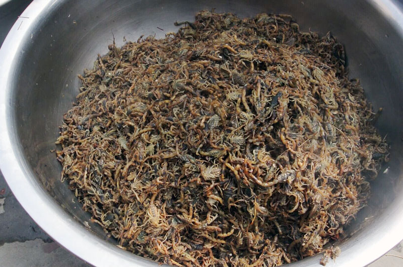隨后,由我廠技術人員陪同客戶,為客戶演示整個加工過程,加工前先把蝎子用冷水浸泡,并反復沖洗幾次,以洗掉蝎子身體上的泥土和其他雜物,洗凈后撈出,放到事先準備好的盆內。