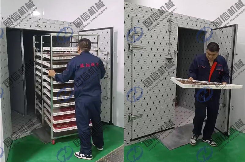 4. 烘干:將腌制好的牛肉條,均勻一致的懸掛在烘干房內(nèi)進(jìn)行烘干,烘干房的熱風(fēng)循環(huán)系統(tǒng)和排濕系統(tǒng),可以提高烘干效率,精準(zhǔn)控溫控濕的智能化操控模式可以使牛肉烘干房的烘干模式接近自然風(fēng)干,保證牛肉干肉質(zhì)鮮美。