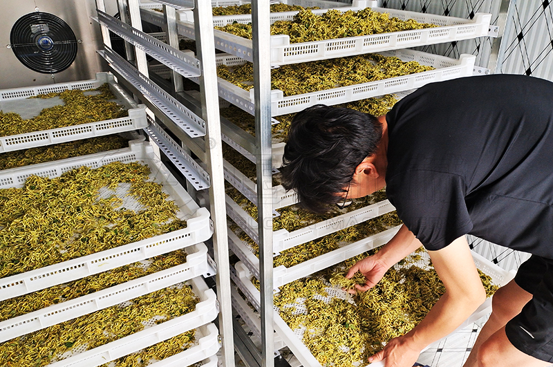 第三階段:溫度控制在50~54攝氏度,升溫時間控制在2~4個小時,此階段可以稍微降低排濕速度,以利于溫度提升,經(jīng)過第三階段金銀花基本已經(jīng)達(dá)到8成干;