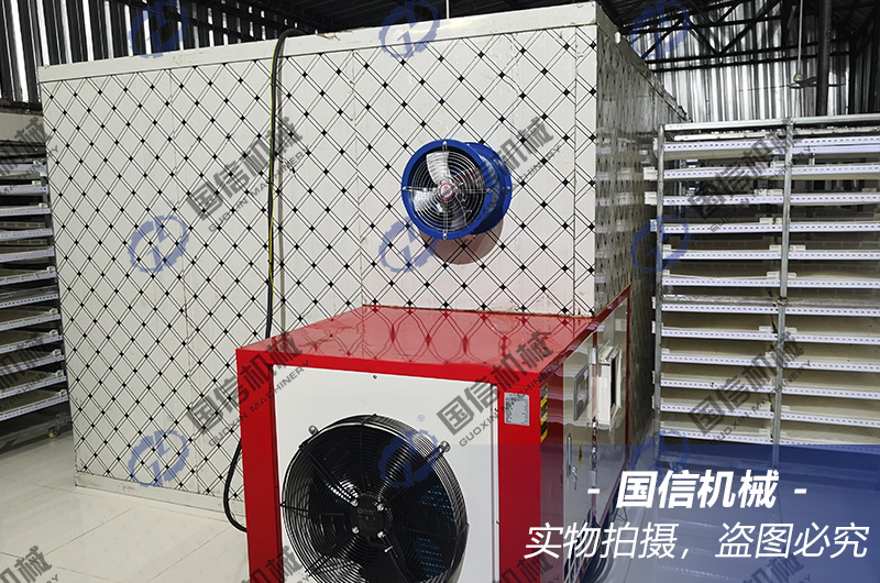 布基納法索客戶采購的是全自動熱泵芒果烘干房,這是一種綠色環保、精準智能的烘干設備。它是由提供穩定熱源的空氣能熱泵做主機,然后將熱量輸送至高保溫性能的聚氨酯保溫板組成的烘干房內部,在烘干房內部的循環風機作用下,熱量會高效循環利用,將均勻擺放在托盤和推車上的芒果干片進行烘干。